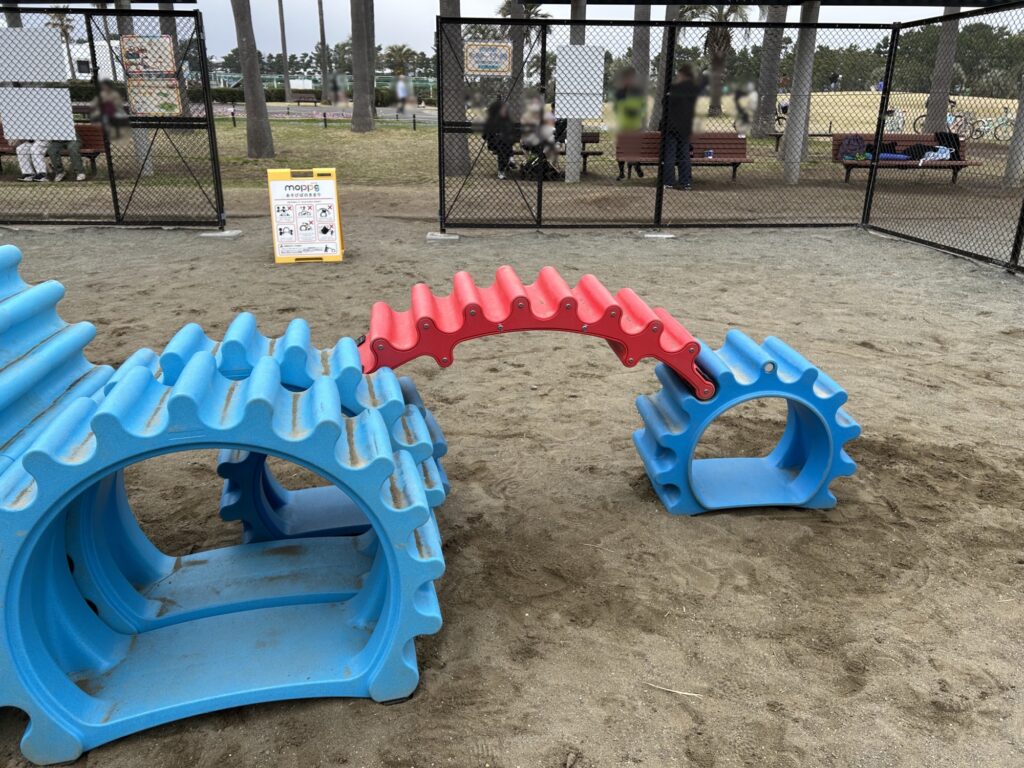 moppsとは、自分で組み合わせて遊び場を作れるのが特徴のモバイル遊具の名称で、交通公園内の広場に設置されている。