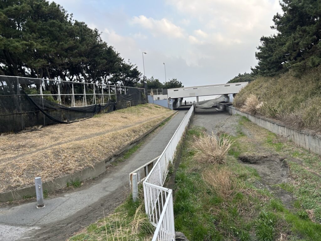 ↑西駐車場から海岸への道。